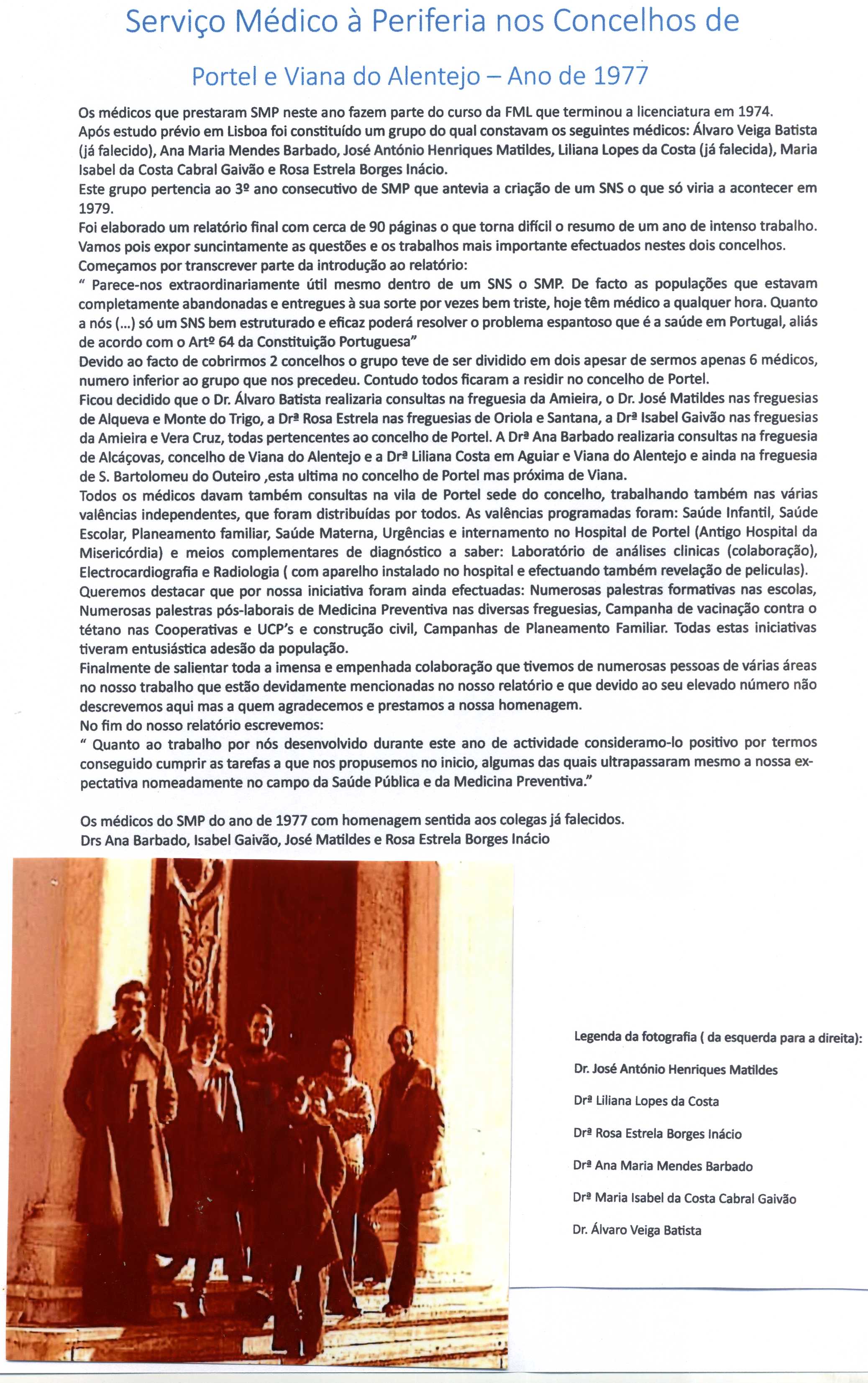 SMP e Portel e Viana do Alentejo 1977 50 anos - Curso Medicina FML, 30 de novembro de 1974 O interior na Periferia Serviço Médico na Periferia - Rui Rosado Albufeira, 1977-1978 Cabeceiras de Basto - 1981 Caminha e Vila Nova de Cerveira - 1975/1976 Corrigir terapêutica errada mas socialmente muito aceite Criar a consulta de Planeamento Familiar O SMP - a alma esquecida do Serviço Nacional de Saúde Odemira - 1976/1977 Povoa do Lanhoso e Vieira do Minho Serviço Médico à Periferia - Madeira Serviço Médico à Periferia - 1976/1977 Serviço Médico à Periferia - Funchal 1981 SMP Excelente Modus operandi SMP Grupo de Avis - 1976/1977 SMP - Portel 1979 SMP - Portel1977 Vila Real 1976 |