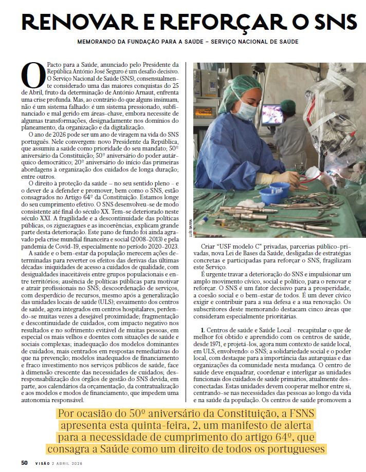 Nos 50 anos da Constituição da República Portuguesa - Artigo 64.º a Fundação para a Saúde - SNS lança o Memorando em parceria com a Revista Visão que pode consultar neste destaque.